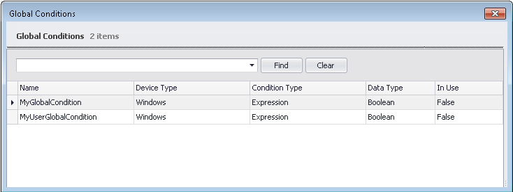 - If you have a large list of global conditions and would like to perform a search, you can use the search box and Find button to filter the list.