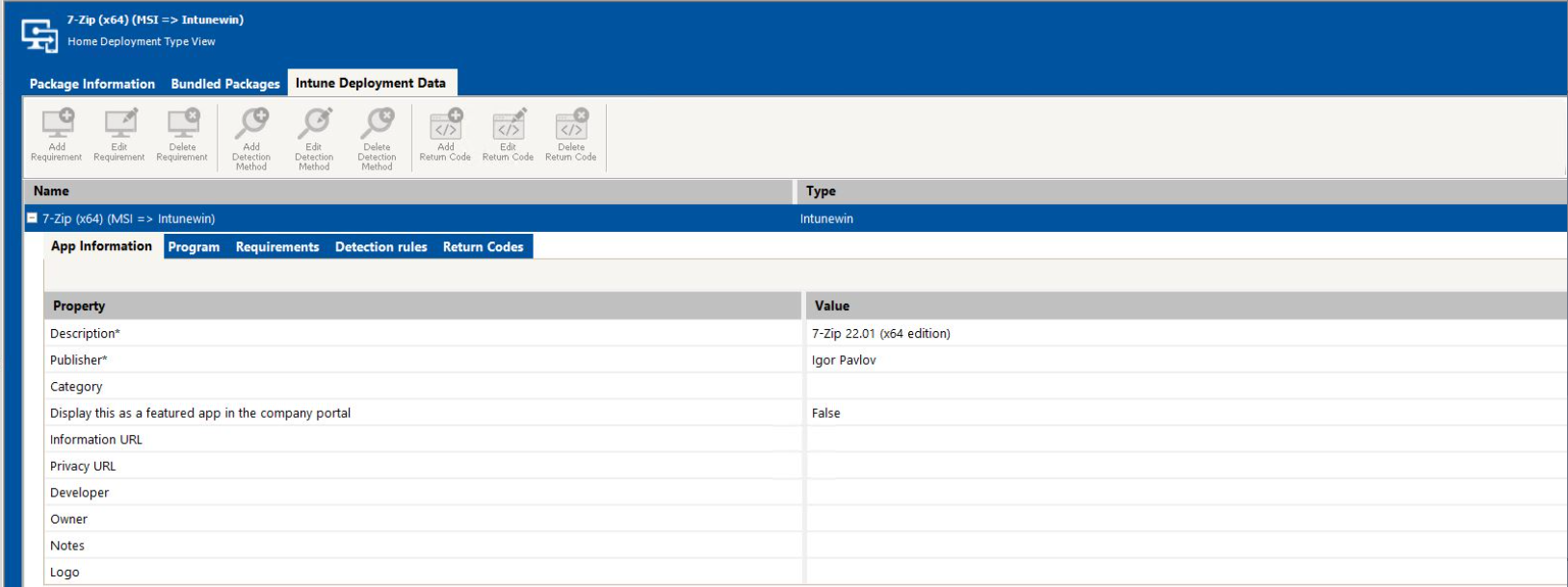 4. View and modify data, as described in Intune Deployment Data Tab / App Information Subtab.