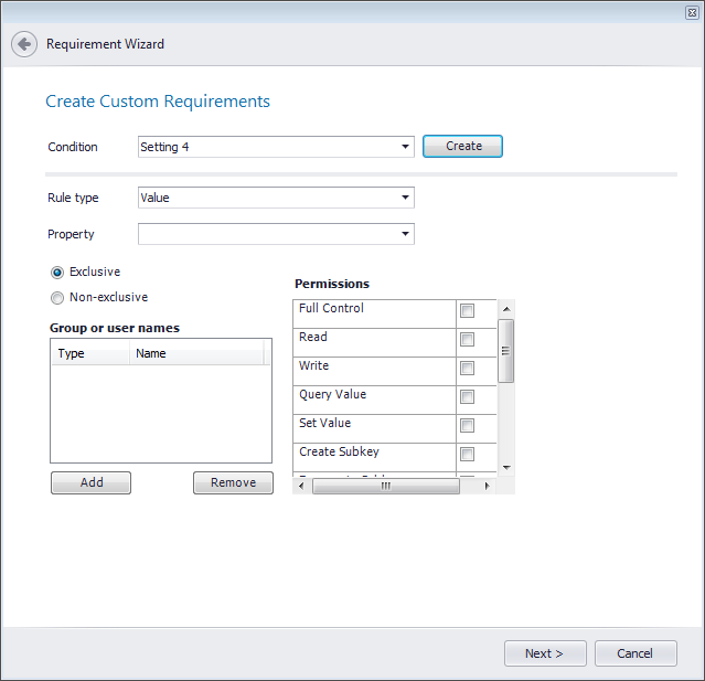 | Permissions | Select the permissions in this list to Allow or Deny that permission to the selected user or group. Only displayed for global conditions with a Setting Type of Registry key that also have a Rule type of Value . |