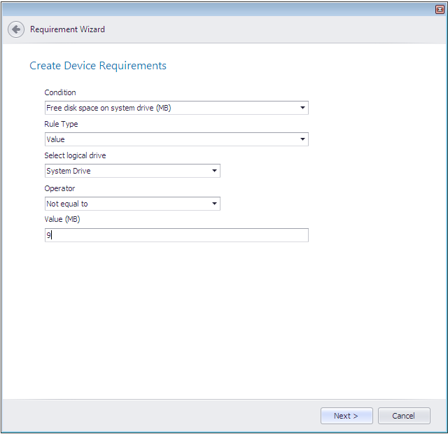 | [Additional Fields] | Additional fields are displayed depending upon the Condition selected. Use these fields to define the requirement for the selected Condition . Active Directory Site—Click the Add button and add a site to the Active Directory Sites list. Co-Managed Device - Click the Add button and specify a valid operator and value. Configuration Manager Site—Click the Add button and add a site to the Configuration Manager Sites list. CPU Speed (MHz)—Enter a value, in MHz, in the Value (MHz) text field. Disk space—Select a drive from the Select logical drive list and enter a value, in MBs, in the Value (MB) text box. InTune O365 Pro Plus Management - Click the Add button and specify a valid operator and value. Number of processors—Enter a number in the Value text box. Operating system—Select operating systems from the Select Operating System list. You can choose just a major category (such as Windows 8 or Windows Server 2012 ) or you can identify a specific operating system / service pack / processor type combination, such as All Windows 8 (32-bit) . Operating system language—Select languages from the Select Operating System Language(s) list. Organizational unit (OU)—Click the Add button and add a OU to the list. Total physical memory (MB)—Enter a value, in MBs in the Value (MB) text box. Windows Store inactive—Enter a value in the Value text box. |