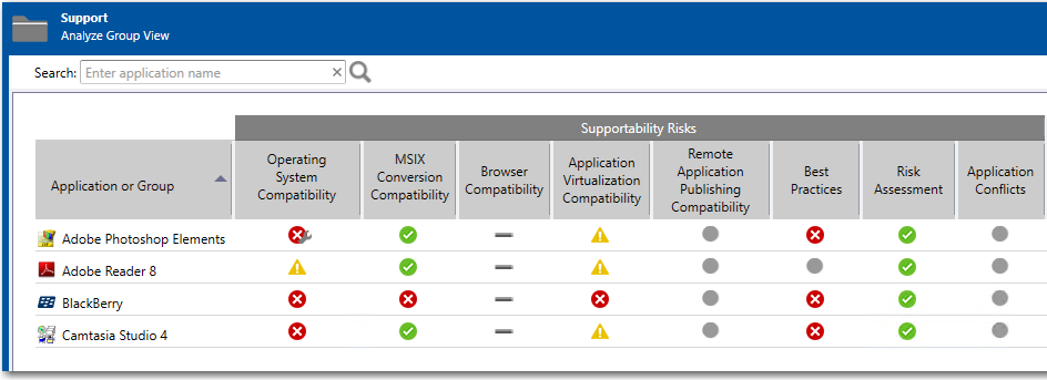Analyze provides summary views that show display a status icon for groups and applications to indicate their overall test status in each of the following categories: