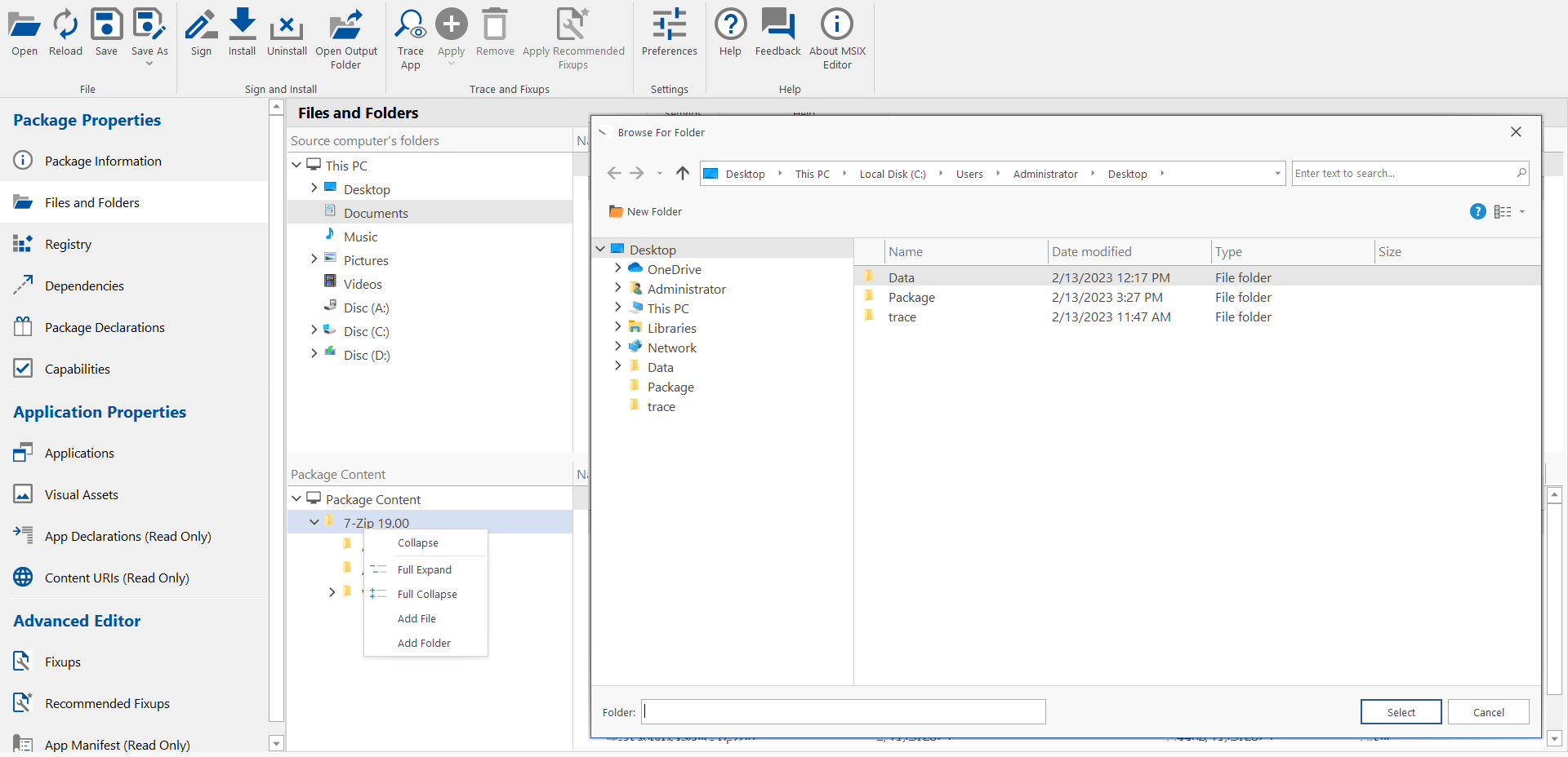 The Files and Folders view of the MSIX Editor lets you add a file or folder to your MSIX package.