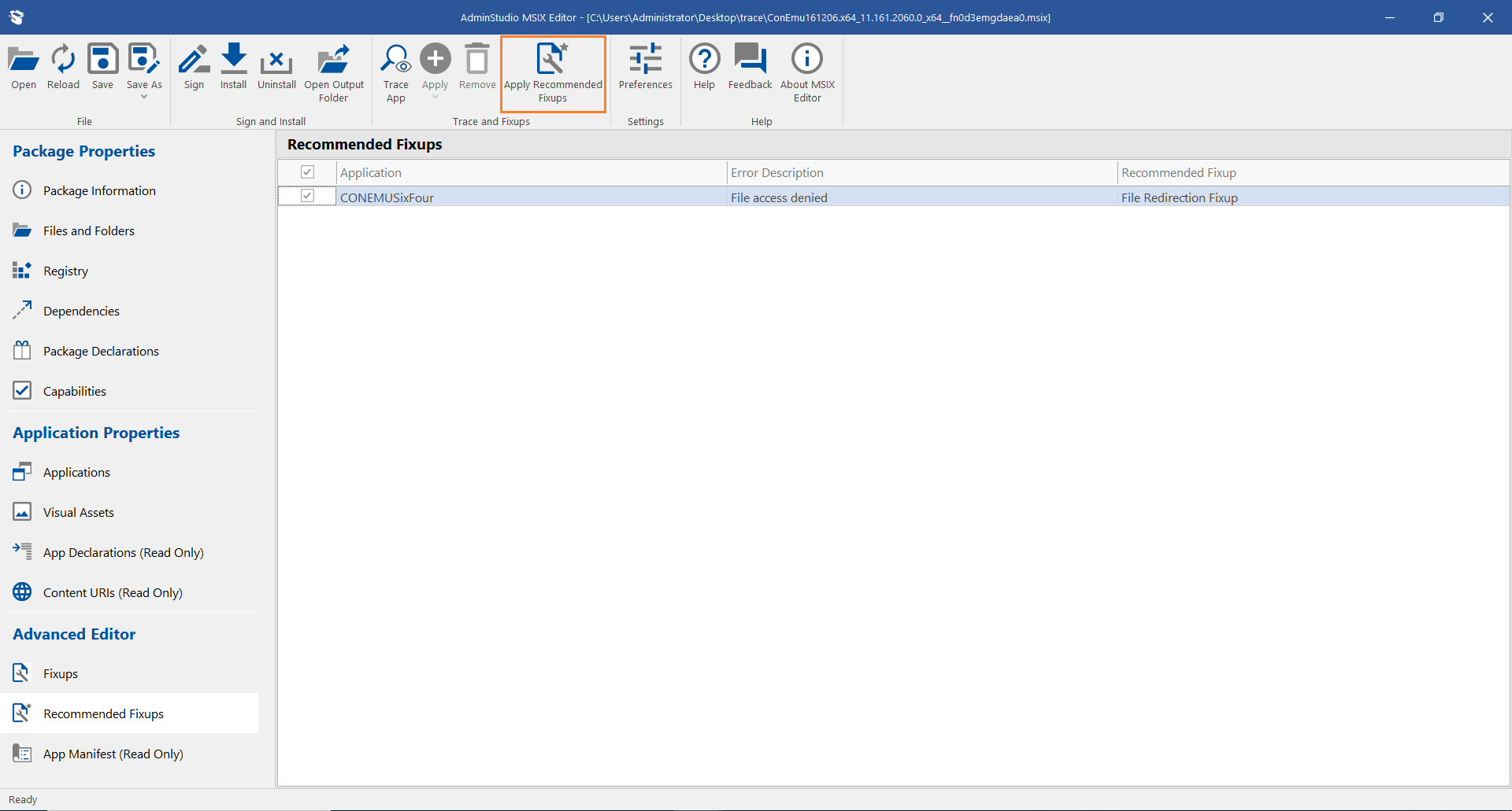noteThe Recommended Fixup button in MSIX Editor ribbon is enabled only when you select fixup in the Recommended Fixups view.