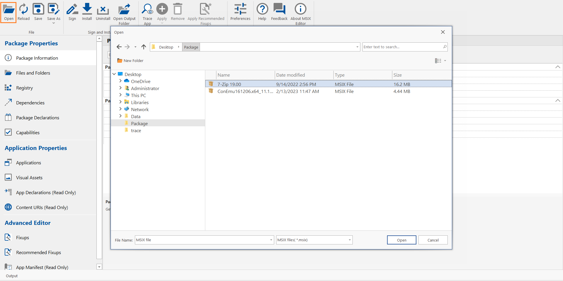 In the MSIX Editor, click the Open button in the ribbon.