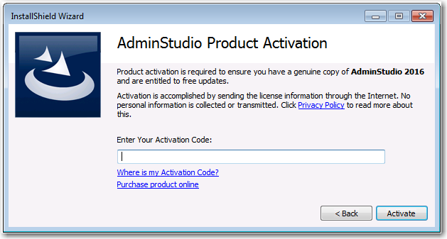 - Contact an AdminStudio sales representative and purchase a activation code for the edition that you want to upgrade to.